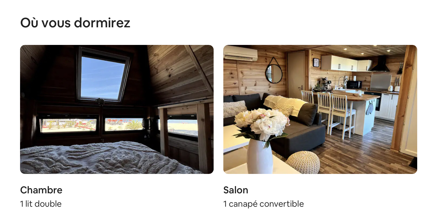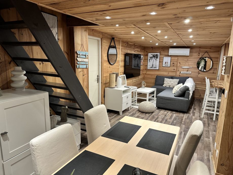 Avec un coin cuisine tout équipé, un côté salle à manger et salon avec grand écran connecté au wifi et apple tv, un grand canapé d’angle convertible en lit deux places pouvant accueillir deux enfants.